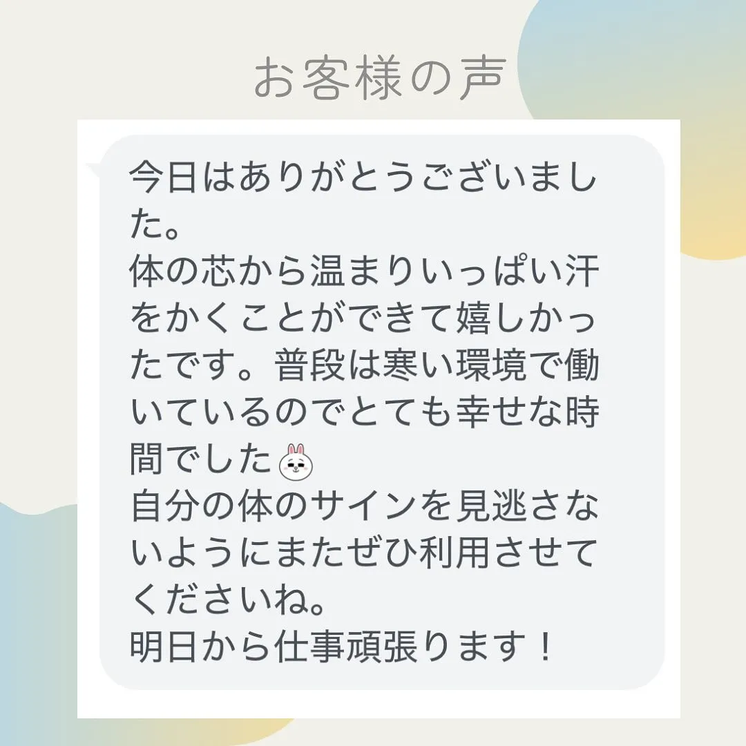 岩盤浴では温まってもすぐに冷えて、また入りに行って温まるけど、なかなか芯まで温まらないのを実感されていて、よもぎ蒸しならいいかも!と初めての体験でした♪