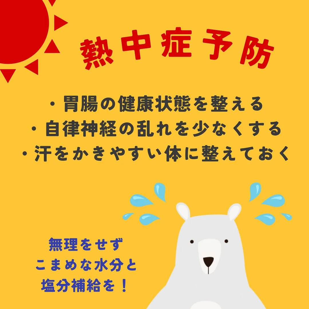 あとは、身体を整えておくことで、熱中症予防にもなりますよ♪